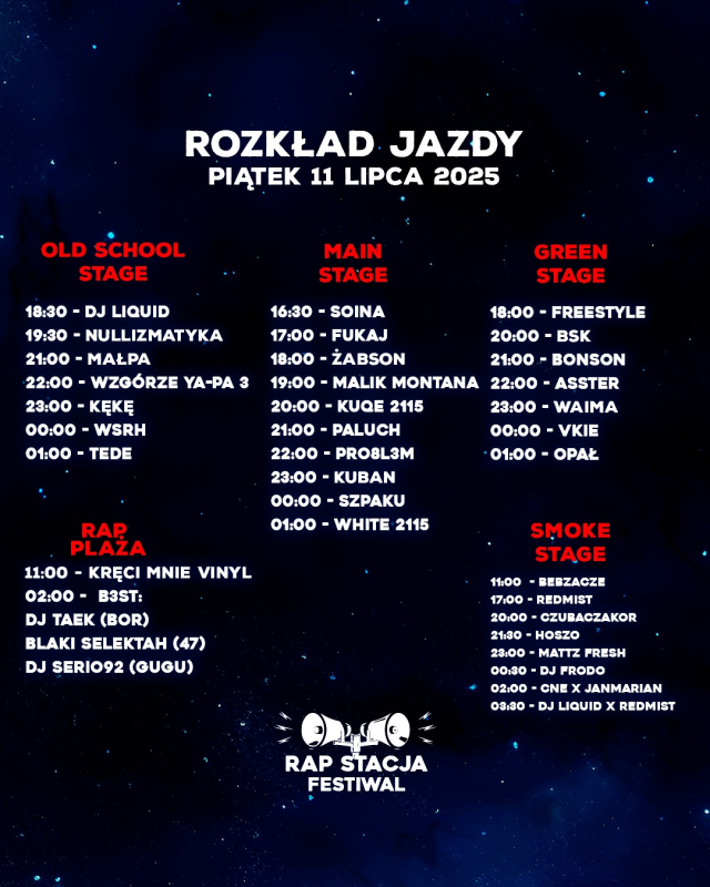 Jak co roku w Sławie usłyszymy zarówno najgłośniejsze postaci obecnego mainstreamu, jak legendy sceny oraz mniej znanych i wschodzących artystów. Wszystko rozbite na trzy koncertowe sceny, dzięki czemu możecie wybrać, która odsłona rapu jest Wam najbliższa. Wśród wielu polskich gwiazd (na czele z wracającym po przerwie na Rap Stację Matą) usłyszymy także szwedzki klasyk - Looptroop Rockers, ikonę niezależnego trueschoolowego brzmienia z Europy, doskonale znaną wszystkim bywalcom czeskiego Hip Hop Kempu. Poniżej rozkład artystów na sceny, a dokładny dzienny harmonogram znajdziecie na grafikach w galerii na dole artykułu.