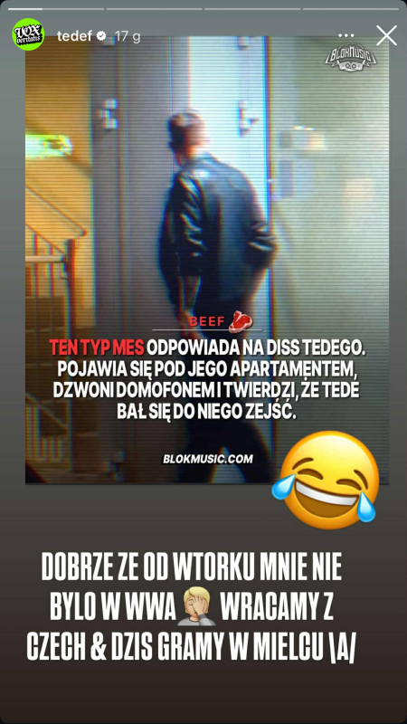Tede udostępnił na swoim instastory newsa, mówiącego o wizycie Mesa pod jego blokiem, pisząc "Dobrze, że od wtorku mnie nie było w Wwa. Wracamy z Czech i dziś gramy w Mielcu", dodając emoji śmiechu przez łzy i facepalmu.