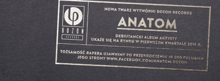 Bozon Records przedstawia swojego nowego gracza. Anatom przedstawiany jest jako "bardzo młody człowiek, który odnalazł konkretną drogę życia, co przekłada się na rap, który tworzy". Jego atuty to charakterystyczna barwa głosu, teksty trafiające w punkt i wyróżniające się flow. Anatom to pierwszy po Tau raper, który wyda swój album nakładem Bozon Records. Tożsamość rapera i więcej info wytwórnia ujawni po przekroczeniu 10 000 polubień jego strony na facebooku.