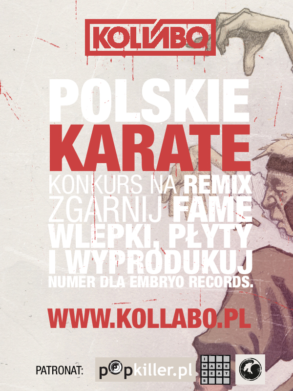 Kollabo wraz z EMBRYO NAGRANIA organizuje konkurs dla wszystkich zdolnych producentów! Każdy z tych, który chce wygrać szansę wyprodukowania utworu na legalne wydawnictwo EMBRYO musi zrobić remix utworu "W 3 dupy" i wrzucić go na swój profil na Kollabo. Termin nadsyłania zgłoszeń mija 19.04.13 o godzinie 23:59! W jury, które wyłoni zwycięzcę zasiadają: Polskie Karate, Dwa Sławy oraz Metro. Dodatkowe nagrody to płyta "Polskie Karate", tshirt oraz wlepki.