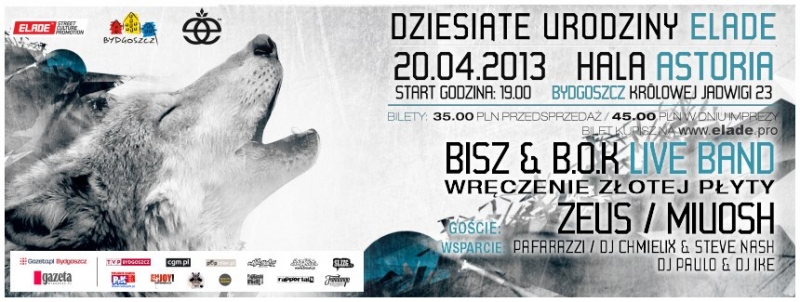 ELADE Street Culture Promotion ma przyjemność zaprosić wszystkich fanów dobrej muzyki oraz rapu na najwyższym poziomie, na najciekawsze hiphopowe wydarzenie ostatnich lat w BDG. Podczas Koncertu w Bydgoskiej Hali Astoria wystąpią, Bisz/B.O.K Band, Zeus oraz Miuosh. Wydarzenie to przygotowywane jest z okazji wręczenia złotej płyty dla Bisza za krążek Wilk Chodnikowy. Impreza odbędzie się w ramach dziesiątych urodzin Elade Street Wear.