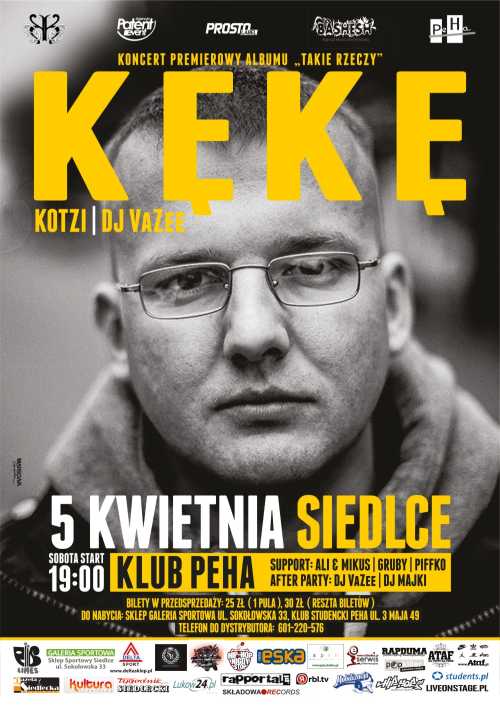 Agencja PATENT EVENT, BASHESH, RAPPORTAL oraz Klub Studencki PEHA z ogromną przyjemnością zapraszają na długo oczekiwany koncert premierowy albumu "TAKIE RZECZY" KĘKĘ w Siedlcach