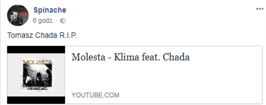 Tutaj przypomnicie sobie jak na śmierć Chady zareagowała cała scena hip-hopowa: Chada R.I.P. - reakcje świata hip-hopu (Peja, Włodi, Tede, Sokół, Pih, Quebo i inni)