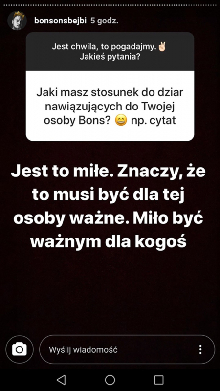 Bonson dołączył do grona osób, które na początek roku poświęciły sporo czasu na pytania fanów na Instastory - nie brakowało wśród nich ciekawych tematów. Od muzycznych planów po kwestie życiowe.