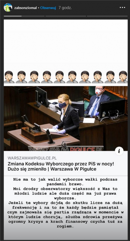 "Nie ma to jak walić wałki wyborcze podczas pandemii, brawo. Moi drodzy obserwatorzy – większość z Was to młodzi ludzie, ale duża część ma już prawa wyborcze. Jeśli te wybory dojdą do skutku, liczę na dużą frekwencję, i na to, że każdy będzie pamiętał czym zajmowała się partia rządząca w momencie, w którym ludzie chorują, służba zdrowia przeżywa ogromny kryzys, a krach finansowy czyha tuż za rogiem" - napisał na swoim Instastory raper, poparł go także Joda udostępniając wpis. Screeny znajdziecie poniżej.