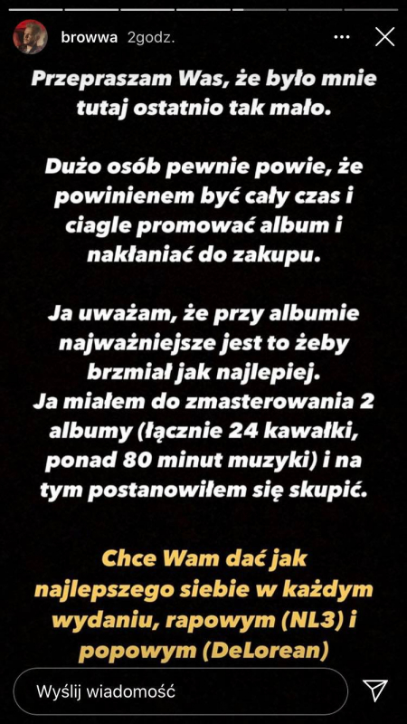 "Ostatnie 10 dni były dla mnie masakrycznie wyczerpujące. Spędzałem w studio po 18h na dobę, pracując nonstop, aby jak najlepiej zrobić oba albumy. Uszy do wymiany." - pisze B.R.O. - "Dużo osób pewnie powie, że powinienem być cały czas i ciągle promować album i nakłaniać do zakupy. Ja uważam, że przy albumie najważniejsze jest to, żeby brzmiał jak najlepiej. Ja miałem do zmasterowania 2 albumy (łacznie 24 kawałki, ponad 80 minut muzyki) i na tym postanowiłem się skupić. Chcę wam dać jak najlepszego siebie w każdym wydaniu, rapowym (NL3) i popowym (DeLorean).""DeLorean" będzie płytą w całości pozbawioną gości, co innego "NL3", na którym znajdziemy m.in. Taua, Szymi Szymsa czy Kubańczyka. Poniżej na slajdach znajdziecie posty opublikowane przez B.R.O wraz z tracklistą albumu.