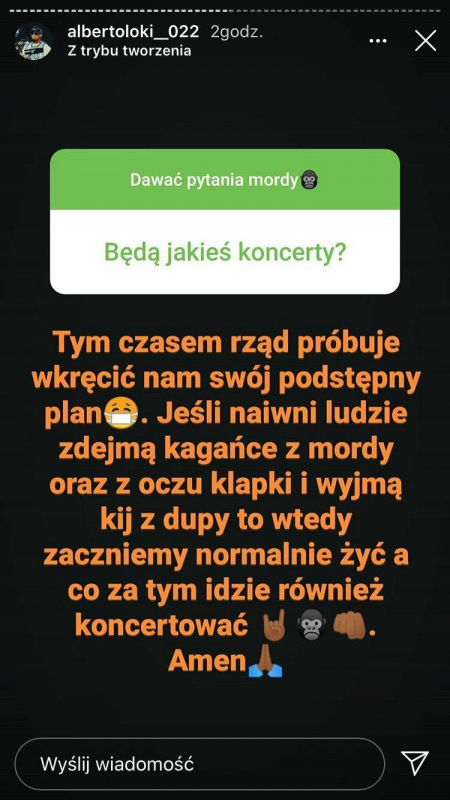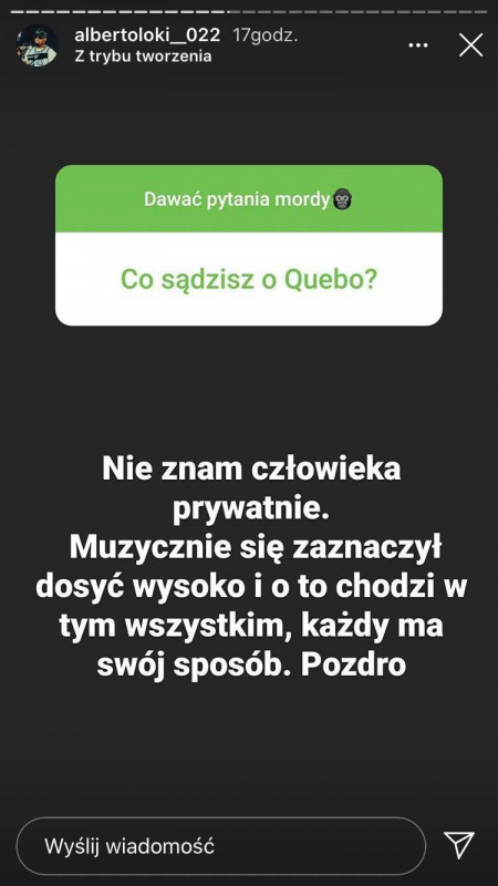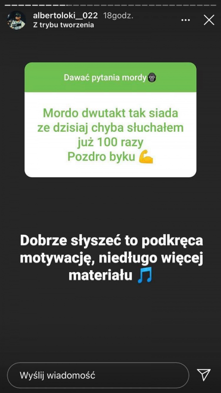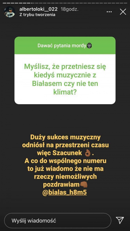 Alberto wjechał ze swoim singlem "Dwutakt", jak z buta, robiąc przy tym niemały szum oraz zgarniając propsy od wielu reprezentantów sceny. Członek GM2L nie spoczywa jednak na laurach. Z jego Instastory dowiedzieliśmy się, że już niedługo otrzymamy od niego kolejny singiel. Ponadto raper zdradził czy jest szansa na jego udział w Fame MMA oraz co myśli m.in. o Szpaku, Białasie czy Quebo.