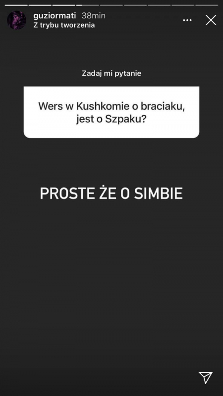 Guzior w krótkim Q&A ujawnił, że planuje w przyszłości zrekrutować również innych raperów do swojej nowej wytwórni. Zdradził również, że na pewno usłyszymy jego wspólny kawałek z Matą oraz, że wersy "Mój brat to też rozegrał spoko / Hakuna Matata" z "K U S H K O M Y" dotyczyły Szpaka, zgodnie z domysłami fanów.