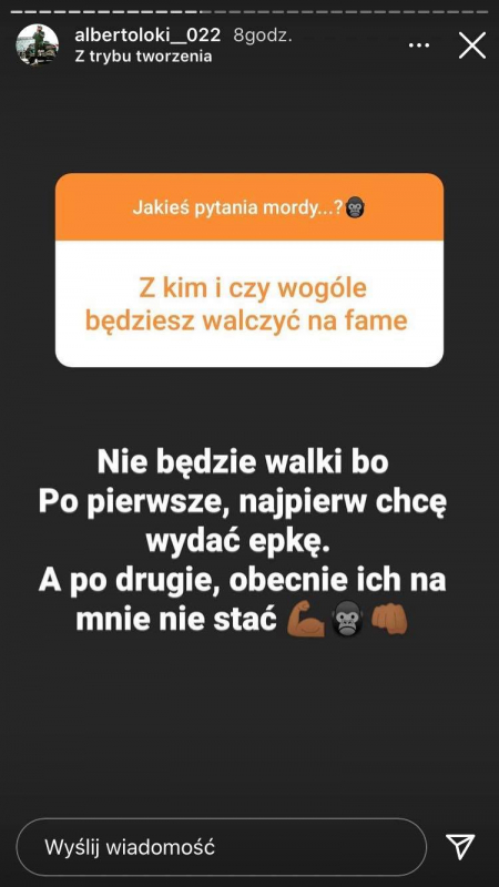 "Nie będzie walki, bo po pierwsze najpierw chcę wydać EP-kę, a po drugie obecnie ich na mnie nie stać." - napisał Alberto.