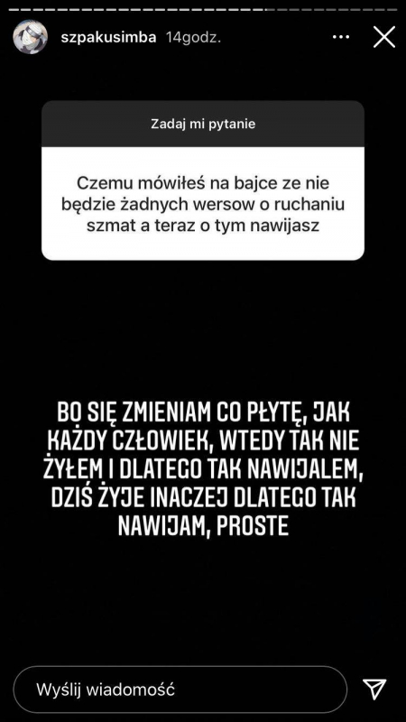 "Dostałem propozycję walki wieczoru, ale nie przyjąłem, bo nie trenuje sportów walki i czułbym się tam jak małpa w cyrku." - pisze Szpaku.