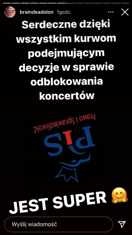 "Serdeczne dzięki wszystkim k*rwom podejmującym decyzje w sprawie odblokowania koncertów. Jest super. Najlepsze jest to, że możesz iść na stand-up, do cyrku czy na kabaret. Ale nie na koncert, biedna szloro. W ten weekend odbyły się dwie duże imprezy stand-upowe na stadionie we Wrocławiu. Przyszło 2x8k osób. Tej, k*rwa – 2 razy 8 000 osób. Ale my nie możemy grać dla kilkuset." - pisze Słoń.