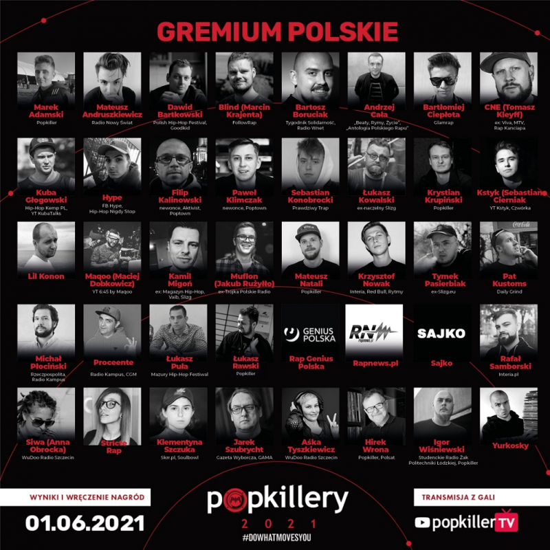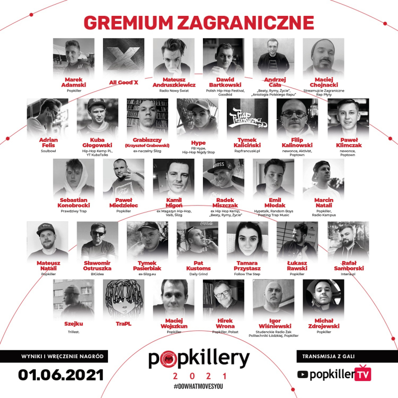 Znajdziecie tu osoby doświadczone, słuchające rapu od 20 czy wręcz 30 lat, ale także młodych pasjonatów chłonących na bieżąco najświeższe produkcje i gorąco o nich dyskutujących. Od wciąż aktywnych i pełnych zajawki pionierów hip-hopowego dziennikarstwa po poszukiwaczy świeżych brzmień i nowych twarzy z podziemia. Różnica wieku między członkami gremium wynosi ponad 40 lat, a ich gusta i spojrzenia różnią się mocno (czasem wręcz skrajnie), co pozwala uzyskać nam możliwie najpełniejszy i najbardziej obiektywny obraz. Dziękujemy każdemu z członków gremium oraz każdemu ze wspierających mediów, dzięki którym inicjatywa Popkillerów może rosnąć w siłę!