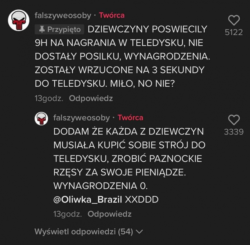 Według występującej w klipie użytkowniczki TikToka o loginie venroika dziewczyny nie dostały pieniędzy, musiały też zadbać o strój i make-up, a na planie czekać godzinami bez jedzenia i picia. A finalnie w klipie były widoczne przez kilka sekund. venroika narzekała też, na to, że Oliwka miała wyśmiewać się z chudych dziewczyn.