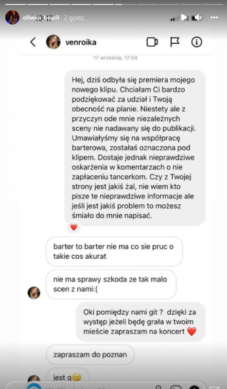 Raperka postanowiła odnieść się do zarzutów poprzez oświadczenie i screen z wcześniejszej rozmowy, gdzie venroika mówiła, że wszystko było ok, nie ma żadnych uwag a w kwestii ustaleń co do wynagrodzenia "barter to barter, więc nie ma co się pruć".