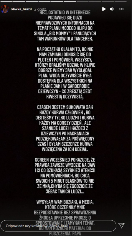 W ostatnich dniach w wielu mediach można było przeczytać o oskarżeniach w stronę Oliwki Brazil ze strony tancerki grającej w klipie "Big Mommy" - zarzuty dotyczyły braku wynagrodzenia, złego traktowania i złych warunków panujących na planie.