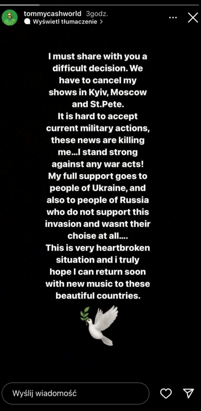 "Muszę się z wami podzielić ciężką decyzją. Odwołujemy nasze koncerty w Moskwie, Sankt Petersburgu oraz Kijowie. Ciężko zaakceptować obecne militarne działania Rosji, te codzienne newsy z Ukrainy mnie niszczą... Jestem stanowczo przeciw jakimkolwiek aktom wojny! Przesyłam wsparcie do wszystkich ludzi z Ukrainy, a także ludzi z Rosji, którzy nie wspierają tej inwazji i nie była ona ich wyborem.... To sytuacja, która łamie serce i mam szczerą nadzieje, że już wkrótce powrócę z nową muzyką do tych pięknych krajów" - napisał Tommy Cash na swoim instastory. Screen znajdziecie poniżej.
