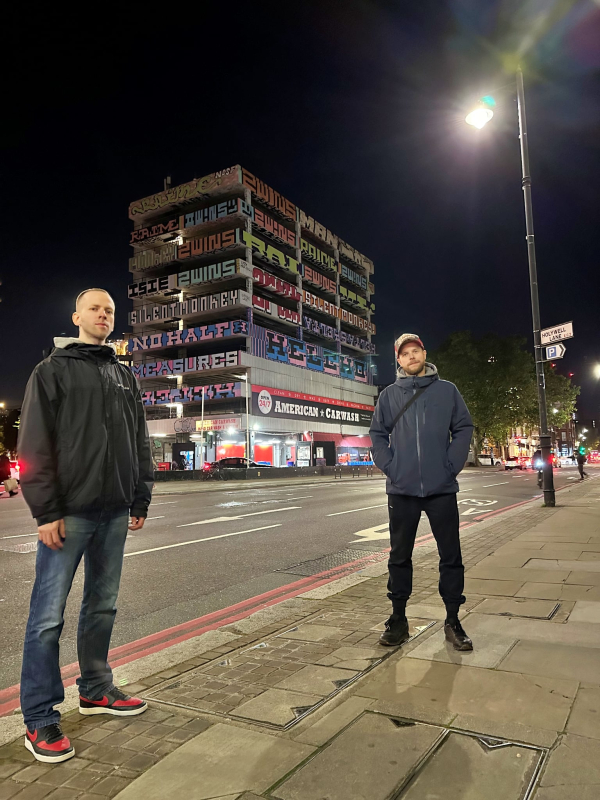 Po pierwszym szoku i fotce z przyczajki na przejściu dla pieszych stwierdziliśmy, że musimy znaleźć dokładny kadr i lokację, gdzie powstało oryginalne zdjęcie. No i tak około kwadrans później, udało się - znaleźliśmy się centralnie w punkcie, gdzie stał legendarny grime'owy MC oraz jego drum'n'bassowy producent. Nie pozostało więc nic innego jak próbować odtworzyć foto. Na początku szło nam topornie, ale gdy reszta grupki zrozumiała, co się dzieje, a w swoje ręce wziął telefon Przekosa, zaczęło to nabierać kolorów. Trwało to dobrych 15 minut, podczas gdy w tle śmigały samochody, a przechodnie zatrzymywali się, przyglądając się tej spontanicznej ulicznej sesji zdjęciowej. Wreszcie jednak po wielu próbach i poprawkach udało się! Rezultat? Cover "Streets, Love & Other Stuff" w alternatywnej wersji nocnej, z budynkiem American Carwash Shoreditch w tle.