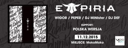 Po długim czasie scenicznej stagnacji powracają do Rap gry z pierwszym koncertem w Warszawie. Mamy zaszczyt zaprosić Was wszystkich na premierowy koncert projektu Empiria, promujący album "Moja Empiria" w składzie - MC's: Wigor, Peper (Mor W.A) \ DJ's : MINIster, Def. Podczas występu usłyszycie nowy materiał ale także klasyki Mor W.A. Support zapewni Polska Wersja, pojawią się także MC's, którzy wystąpili gościnnie na albumie "Empiria".